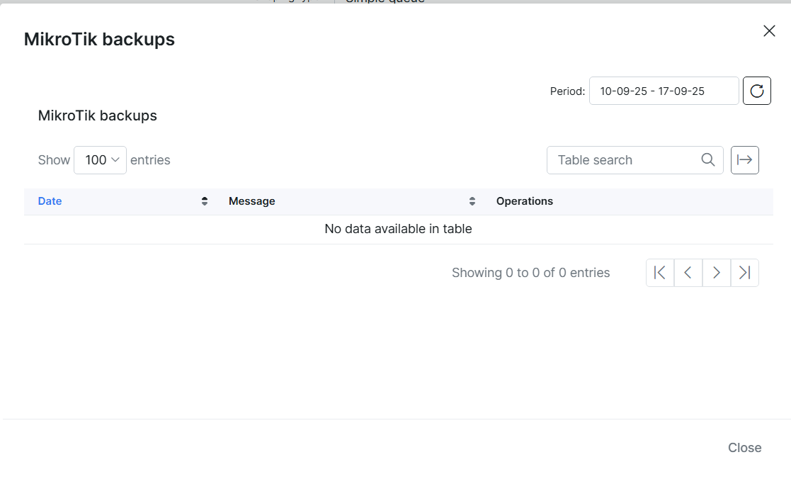 Also, if we click on a router then Mikrotik then Backups, the default view is just of the previous week. If the router hasn’t had any config changes in the previous week, then it doesn’t show anything. The default view should surely list the last 5 backups or similar?